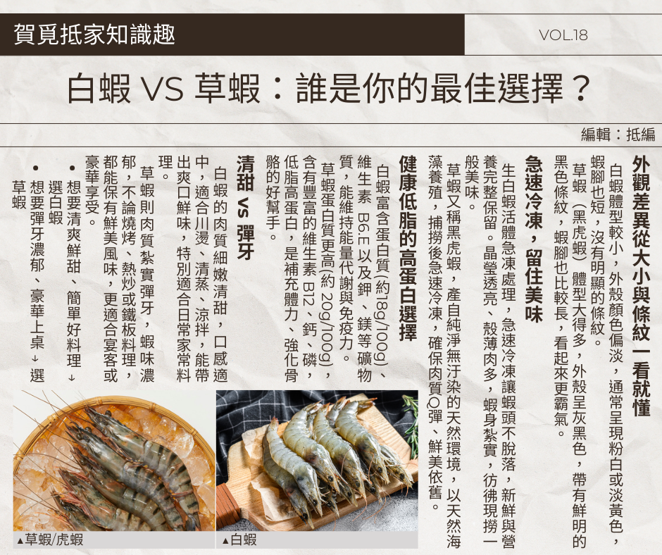 偏好清爽、輕鬆料理的海鮮滋味,白蝦絕對是首選;想要肉質飽滿、口感紮實,在聚會餐桌上展現氣勢,草蝦則是不二之選。